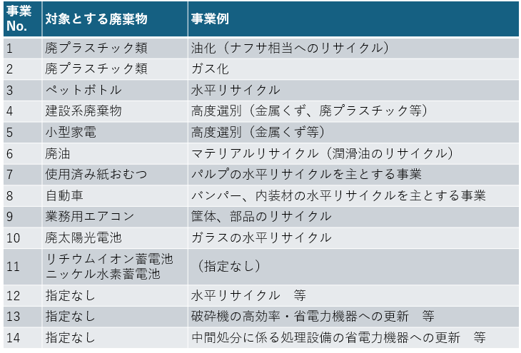 公募対象事業は、原則として、以下の14区分のいずれかに該当する事業とします。応募しようとする内容が複数の区分に該当する場合や、いずれの区分に該当するか不明な場合、14区分以外の内容での応募を希望する場合等は、個別に事務局までお問合せください。認定制度の概要は、以下の環境省資料をご参照ください。